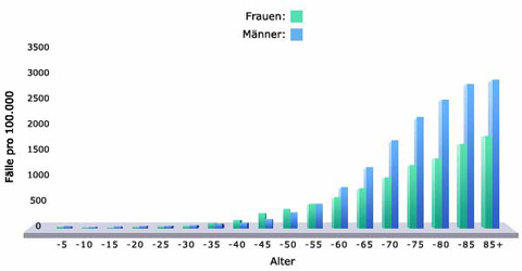 Der Auszug aus dem Krebsregister Deutschland zeigt deutlich die altersabhängige Neuerkrankung an Krebs.