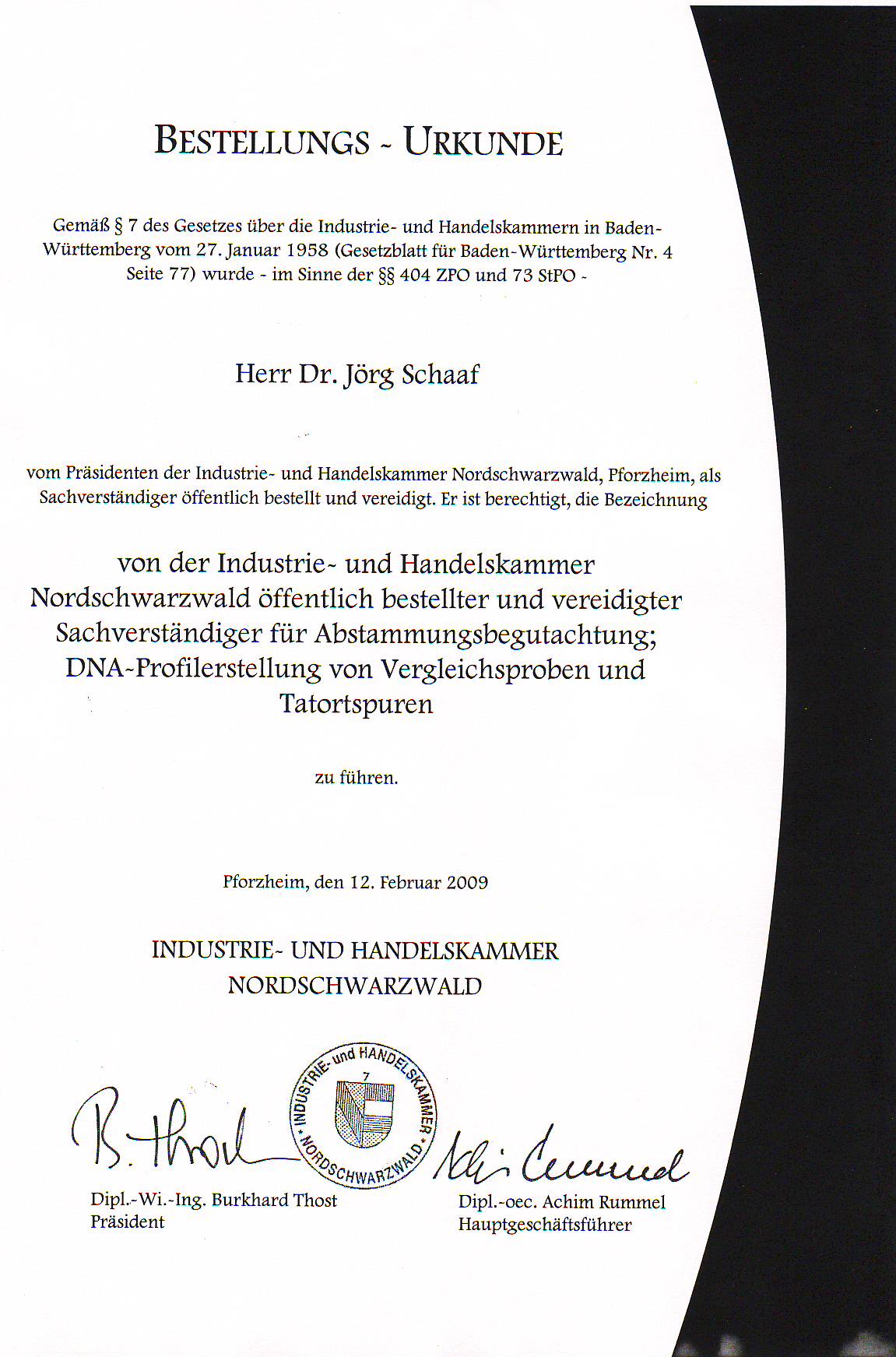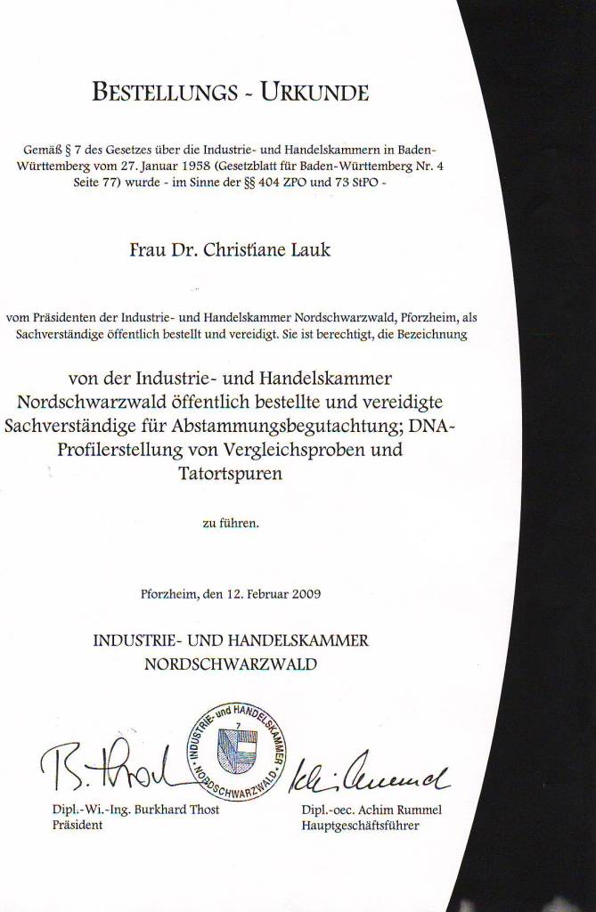 2009 Öffentliche Bestellung und Vereidigung in Abstammung und Spurenanalyse.
